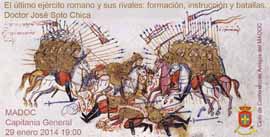 El miércoles, 29 de enero de 2014 en el Salón del Trono de Capitanía tuvo lugar una conferencia pronunciada por el Profesor de Historia José Soto Chica de la Universidad de Granada titulada “El último ejército romano y sus rivales: formación, instrucción y batallas”. La Conferencia, con una audiencia que completó la sala, se enmarca dentro de las actividades culturales que organiza el MADOC abiertos a la sociedad de Granada en colaboración de una asociación cultural denominada “ Amigos del MADOC”.