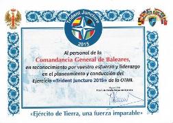 La Comandancia General de Baleares y en concreto el Regimiento de Infantería “Palma” 47, han recibido un reconocimiento en forma de diploma, firmada por el General Jefe del Estado Mayor del Ejército D. Jaime Domínguez Buj, por la participación en el Ejercicio de la OTAN TRIDENT JUNCTURE.