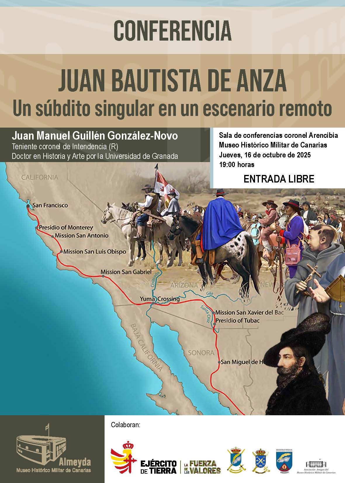 Conferencia “JUAN BAUTISTA DE ANZA. Un súbdito singular en un escenario remoto” cuyo ponente es, d. Juan Manuel Guillén González-Novo, que tendrá lugar el viernes 17 de octubre, a las 19:00 horas, en la sala de conferencias “Coronel Arencibia” del Museo Histórico Militar de Canarias, en el Fuerte de Almeyda, sede del Centro de Historia y Cultura Militar de Canarias.