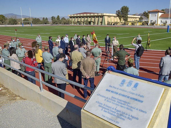 El Presidente de la Diputación de Almería, Javier Aureliano García Molina y el Jefe de la Segunda Subinspección General Del Ejército (Sur), general de brigada Juan Hernández Gutiérrez, acompañados por el Jefe de la Brigada «Rey Alfonso XIII» II de La Legión, general de brigada Marcos Llago Navarro, han inaugurado, hoy 8 de octubre, en la Base «Álvarez de Sotomayor», la nueva pista de deporte de esta Unidad Militar.