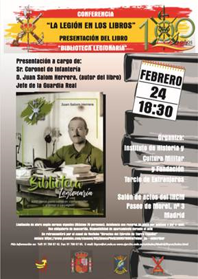 Esta actividad enmarcada en el «Camino del Centenario» y patrocinada por el Instituto de Historia y Cultura Militar de Madrid acoge en su sede, el 26 de marzo, la conferencia «La Legión en los libros» así como la presentación del libro «Biblioteca Legionaria».