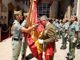 El momento más entrañable de la jornada se produjo con la despedida de la Bandera del Tercio “D. Juan de Austria” en un emotivo acto realizado en el patio interior del edificio del Cuartel General, engalanado para la ocasión. Al mismo asistieron las autoridades militares de la plaza y los jefes acompañados por los guiones de las unidades de la BRILEG, así como una representación de cuadros de mando y tropa. El teniente general dirigió a los asistentes unas cálidas palabras en las que recordó su paso por la milicia. A continuación el general firmó en el Libro de Honor de la BRILEG.