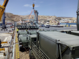 Desde las primeras horas del miércoles, el Grupo de Apoyo a la Proyección de la Agrupación Logística Nº11 (GAPRO 11) estuvo supervisando el embarque en el buque “Camino Español” de vehículos y material a cargo de personal de la VIII Bandera “Valenzuela” (Unidad base del Grupo Táctico “Colón”). Entre el material embarcado se encuentra Vehículos de Alta Movilidad Táctica (VACTAC), tanto de transporte de personal como de armamento, vehículos IVECO “Lince”, camiones pesados de transporte y vehículos ligeros.