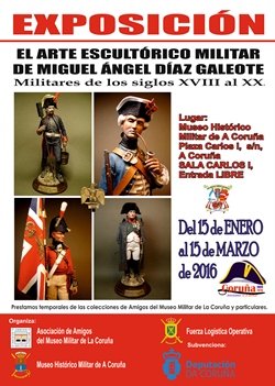El Museo Histórico Militar de A Coruña con la colaboración de la Asociación de Amigos del Museo Militar de la Coruña, la Fuerza Logística Operativa y subvencionado por la Diputación da Coruña, presenta la exposición "El Arte Escultórico Militar de Miguel Ángel Díaz Galeote. Militares de los siglos XVIII al XX" gracias a los prestamos temporales de esculturas procedentes de colecciones de particulares y de Amigos del Museo Militar de la Coruña.
