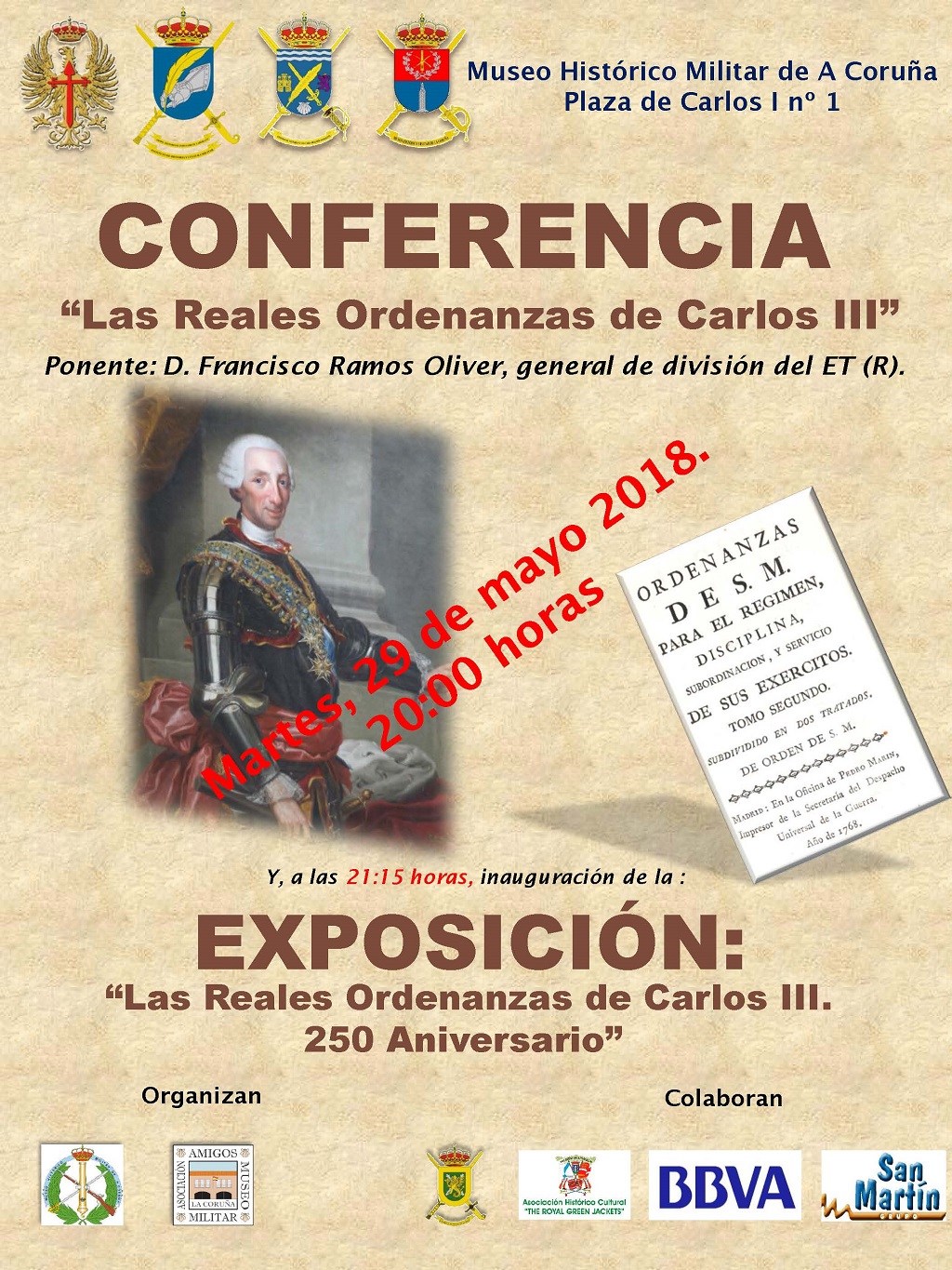El Museo Histórico Militar de A Coruña ofrece la 3ª conferencia de su Ciclo de Primavera que lleva por título “Las Ordenanzas Militares de Carlos III” , será impartida por D. Francisco Ramos Oliver, general de división del Ejército de Tierra (retirado), que es licenciado en Geografía e Historia por la UNED. Ha desempeñado, entre otros cargos, el de director del Instituto de Historia y Cultura Militar. Actualmente es director gerente de la Fundación Museo del Ejército y presidente de la Asociación de amigos de la Historia y Cultura Militar.