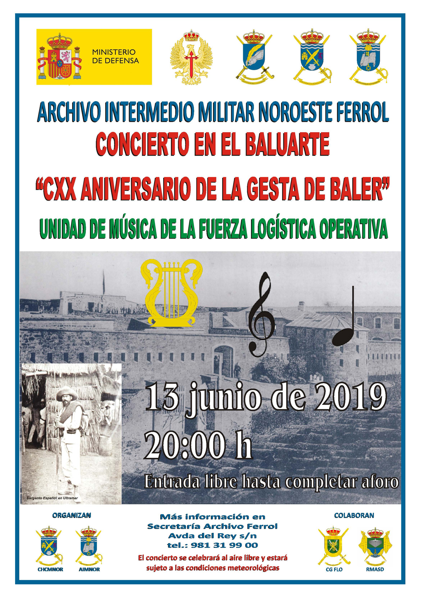 El Baluarte, sede del Archivo Intermedio Militar Noroeste del Ejercito de Tierra, es el escenario elegido para que el próximo jueves 13 de Junio a las 20:00 horas se celebre un concierto a cargo de la Unidad de Música de la Fuerza Logística Operativa en recuerdo a los Héroes de Baler, la historia de los últimos de Filipinas, con motivo de la conmemoración del 120 aniversario de esta gesta, uno de los episodios más señalados de nuestra historia militar y, por ende, de la historia de España.