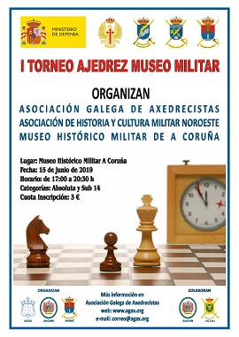 El Museo Histórico Militar de A Coruña junto con la Asociación Galega de Axedrecistas y la Asociación de Historia y Cultura Militar Noroeste, organiza el I Torneo Ajedrez Museo Militar. Patrocinan la Asociación de Historia y Cultura Militar Noroeste y el Cuartel General de la Fuerza Logística Operativa.