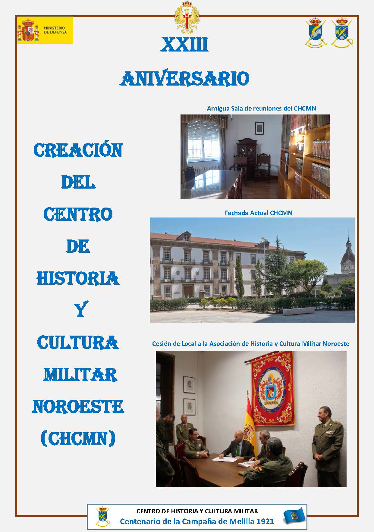 Con la Celebración del XXIII aniversario del Centro de Historia y Cultura Militar Noroeste, pretendemos informar a los usuarios de esta magnífica herramienta, de la vida y vicisitudes de esta orgullosa Unidad que tiene como lema contribuir a la difusión de los tesoros patrimoniales de nuestro Ejército.