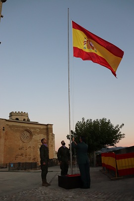 El acto, que tuvo lugar el pasado jueves 23 de octubre a las 19:00 horas, estuvo presidido por el general de brigada Prudencio Horche Moreno, Comandante Militar de Zaragoza y Teruel, y contó con la presencia de diversas autoridades civiles y militares, además de numerosos vecinos y visitantes que llenaron la plaza para rendir homenaje a los símbolos nacionales.