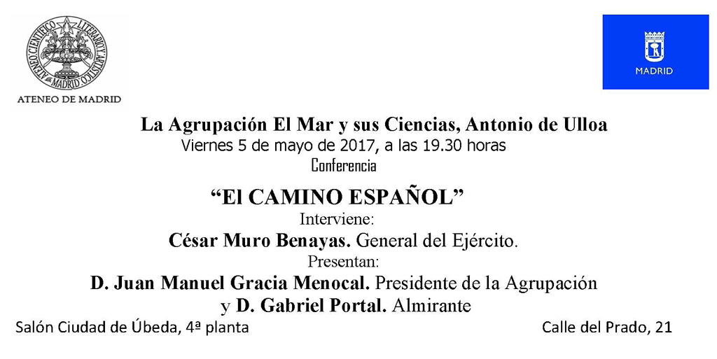 La Agrupación El Mar y sus Ciencias del Ateneo de Madrid le invita a la Conferencia "El Camino Español", en la que interviene el general del Ejército D. César Muro Beneyas y que será presentada por el Presidente de la Agrupación D. Juan Manuel Gracia Menocal y el almirante D. Gabriel Portal