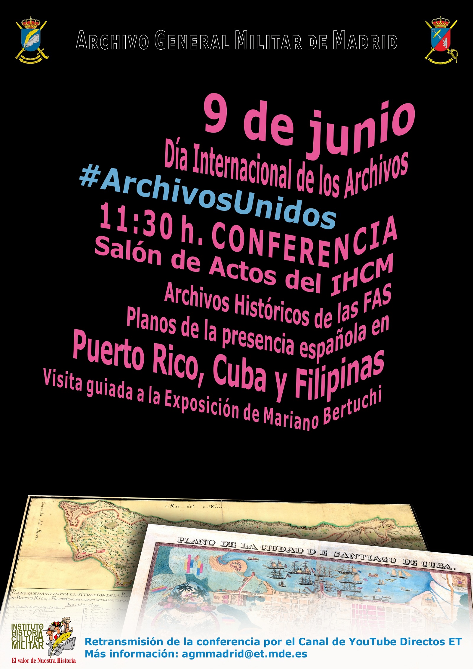 El AGMMadrid celebra dicho día con una conferencia a las 11.30h en el salón de Actos del IHCM en la que se resaltará la importancia de dicho día que coincide con el 75º aniversario del Consejo Internacional de los Archivos (ICA). Este año el lema para esta celebración es #ArchivosUnidos, por lo que se hablará sobre los Archivos Históricos del Ministerio de Defensa. A continuación se pondrá un video corto sobre el AGM de Madrid y luego, con una exposición de mapas, se conmemorara la efemérides de este año sobre la presencia española en Puerto Rico, Cuba y Filipinas. Al finalizar la conferencia, se hará una visita guiada a la sala de exposiciones para ver la obra de Mariano Bertuchi.