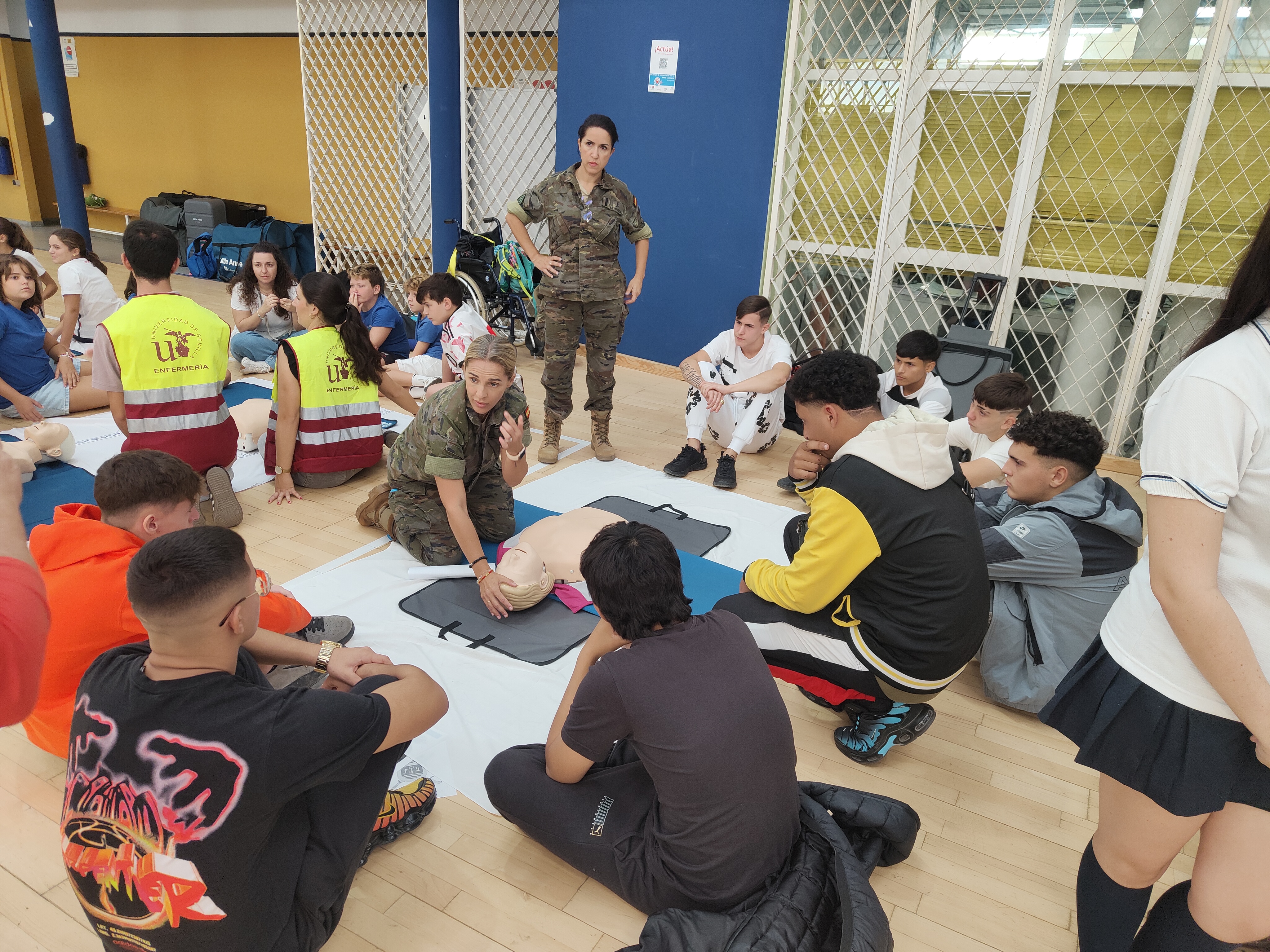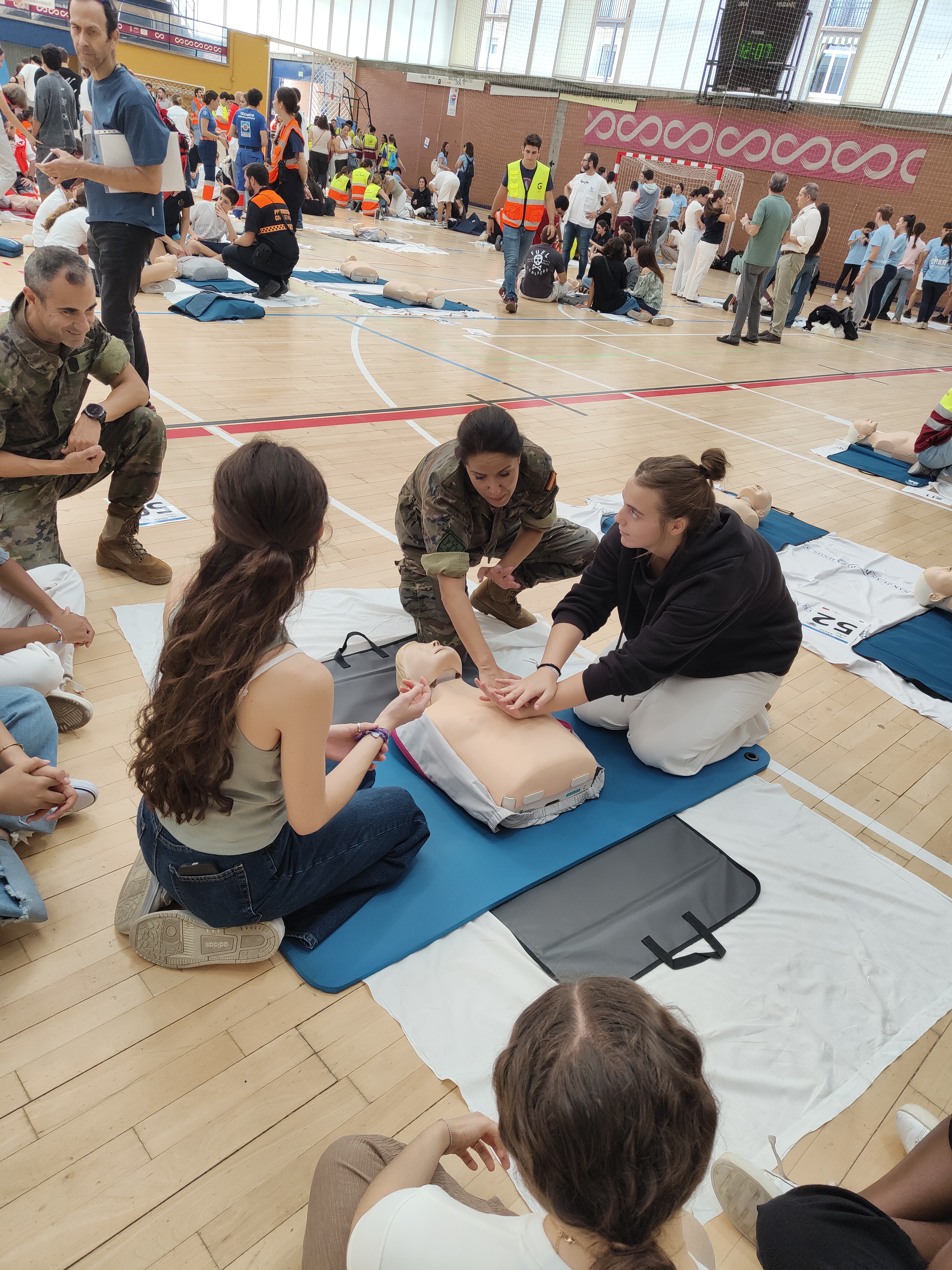 Bajo la dirección del Cte. enfermero González Bayard, un equipo de seis personas con conocimientos de RCP básica han colaborado como instructores en la formación básica de asistencia en emergencias de los alumnos: