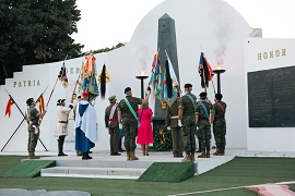Posteriormente, los guiones y banderines rindieron homenaje a los caídos en un emotivo y sentido acto en el que se depositó una corona de flores en el monumento a los caídos que preside el patio de armas, honrando así la memoria de todos aquellos que dieron su vida por España.