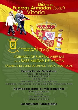 El día 8 de junio, la Comandancia Militar de Álava organiza una jornada de puertas abiertas y múltiples actividades en la Base de Araca, Vitoria, en horario de 11 a 15 horas, para conmemorar el Día de las Fuerza Armadas 2019.