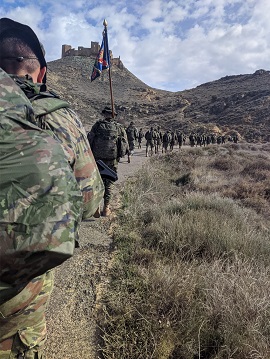 El Batallón realizó un recorrido de 21 km y 600 m de desnivel, iniciando el movimiento desde sus instalaciones ubicadas en el emblemático Acuartelamiento Sancho Ramírez de la ciudad de Huesca. La marcha de endurecimiento discurrió por las localidades de Tierz, subiendo hasta la zona de las trincheras donde se pudo apreciar las espectaculares vistas de la Hoya de Huesca. Posteriormente la Unidad se dirigió a la localidad de Quicena, llegando al histórico Castillo de Monte Aragón.
