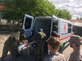 Durante la práctica se llevo a cabo la simulación del traslado de bajas "sucias" desde el lugar del incidente hasta la estación sanitaria donde, una vez descontaminadas, fueron trasladadas en plataformas de evacuación sanitarias "limpias" a la formación sanitaria de tratamiento.