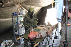 El curso ha finalizado con un ejercicio final de entrenamiento FTX-LIVEX, de dos días de duración, ambientado en las primeras fases de una Operación de Estabilización y con el apoyo de la Unidad de Simulación, Control y Arbitraje de la Brigada de Sanidad. Durante este ejercicio cabe destacar la actuación de los alumnos en un ejercicio situacional de gestión de un incidente IED, en el que tuvieron que cubrir secuencialmente todas las acciones de la cadena asistencial, bajo la supervisión del personal instructor y resolviendo los eventos inyectados por estos, desde la asistencia inicial a las bajas, su estabilización en el terreno, su puesta en estado de evacuación, y su evacuación y transferencia a la FST de destino, para lo que se proyectó una capacidad RW-MEDEVAC sobre HT-17 CHINOOK del BHELTRA V.