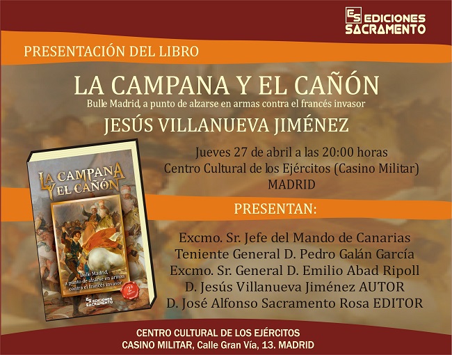 El Excmo. Teniente General Jefe del Mando de Canarias D. Pedro Galán García, El Excmo. Sr. General D. Emilio Abad Ripoll, El Editor D. José Alfonso Sacramento Rosa, presentan el libro de D. Jesús Villanueva Jiménez "La Campana y el Cañón. Bulle Madrid a punto de alzarse en armas contra el francés invasor"