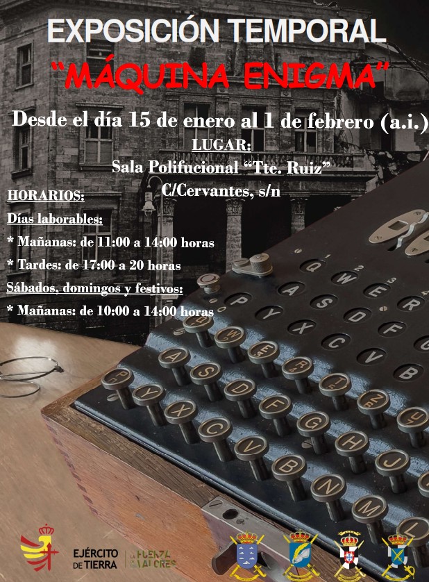 El Centro de Historia y Cultura Militar de Ceuta ha inaugurado la exposición ‘La Máquina Enigma’ comisariada y presentada por el investigador y divulgador Ángel Tarifa.Esta exposición va más allá de los paneles explicativos y permite observar de cerca piezas fundamentales que ayudan a comprender el funcionamiento y la evolución de la máquina Enigma pues la exposición ofrece una visión general de la Enigma desde un punto histórico y técnico, con recursos que permiten entender su montaje y los distintos modelos.