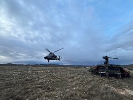 Asimismo, coincidente con el ejercicio Escudo Mistral, se ha desarrollado el ejercicio Humble Flare, dirigido por las Fuerzas Aeromóviles del Ejército de Tierra (FAMET), y que ha contado con la participación de dos NH-90, dos Cougar, dos ECC665 Tigre y un CH47 Chinook. Este hecho ha permitido una estrecha colaboración para ejecutar prácticas de helitransporte, emboscadas antiaéreas y secuencias de adquisición y tiro.