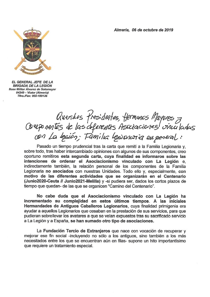 El general se dirige a presidentes, hermanos mayores y componentes de las asociaciones