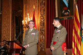El teniente general Ricardo Álvarez-Espejo García toma posesión del cargo como Inspector General del Ejército en el Salón del Trono de Capitanía en un acto presidido por el JEME GE Jaime Domínguez Buj, en presencia de la delegada del gobierno en Cataluña, María de los Llanos de Luna Tobarra y la vicepresidenta del Govern de Catalunya, Joana Ortega i Alemany, entre otras autoridades.