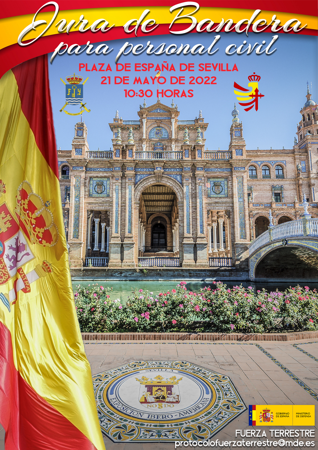 El Cuartel General de la Fuerza Terrestre organiza el próximo día 21 de mayo a las 10:30 horas una Jura de Bandera para personal civil en la Plaza de España de Sevilla.