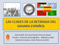 El Coronel José Ramón Ortiz de Zárate, Director de la Colección Museográfica y de la Biblioteca de la Academia General Militar, impartió ayer en la Cátedra Cervantes de la Academia General Militar la conferencia ´Las claves de la retirada del Sáhara Español`. En esta ponencia profundizó en las razones de por qué el Sáhara Occidental sigue siendo la última colonia de África sin descolonizar.