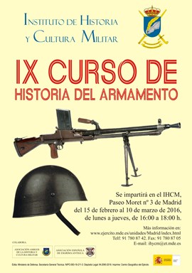 El Instituto de Historia y Cultura Militar en colaboración cn la Asociación Amigos de la Historia Militar y la Asociación Española de Esgrima Antigua, se complacen en convocar el IX Curso de Historia del Armamento. Este curso va dirigido a cuantas personas deseen profundizar en el conocimiento de este apartado fundamental en la construcción de la historia. Dentro de este curso se realizará una demostración de Esgrima Antigua