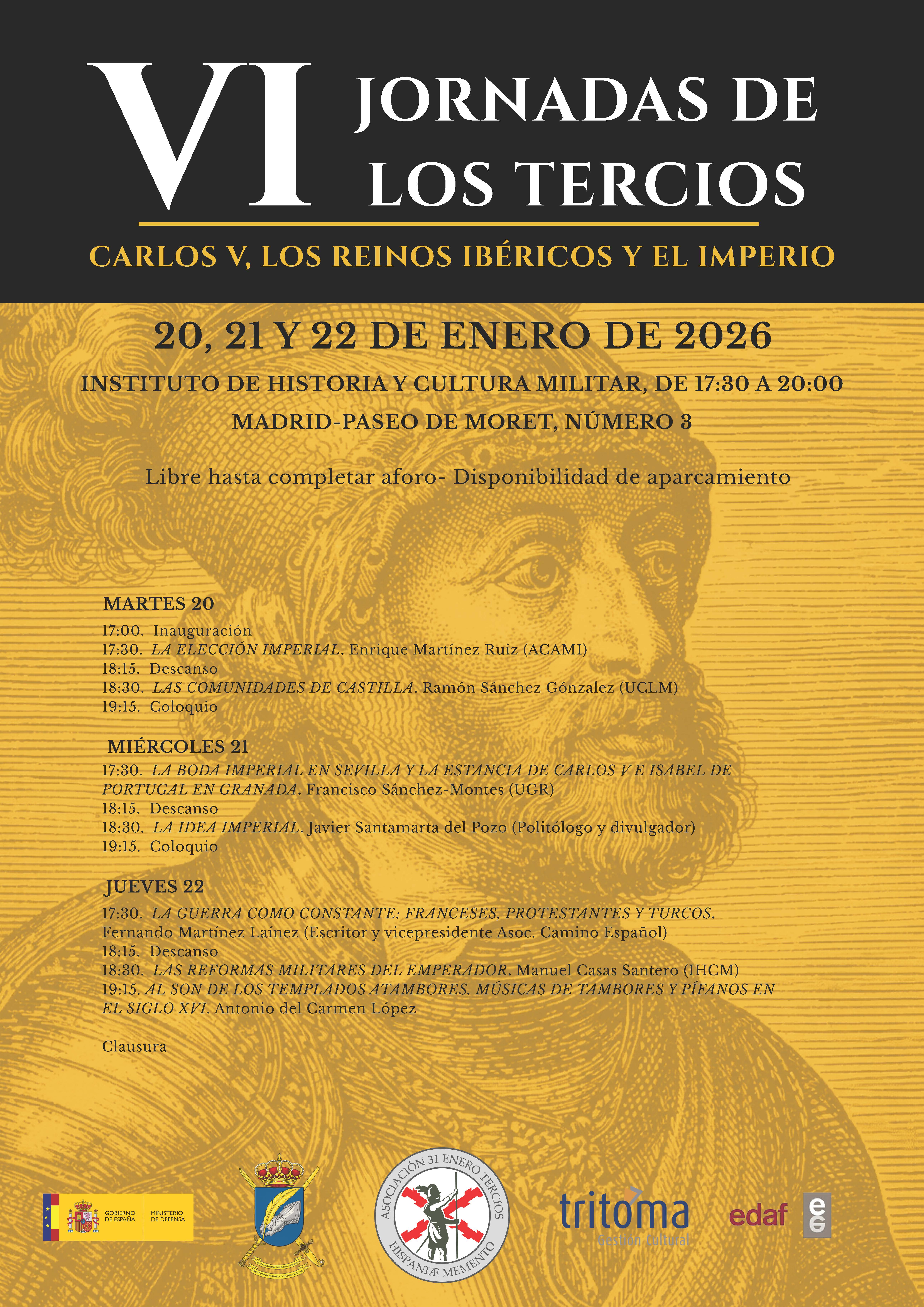 El Instituto de Historia y Cultura Militar, y la asociación 31 Enero Tercios han llevado a cabo las VI Jornadas de Los Tercios, celebradas en el salón de actos “Ejército Español” de la sede central del IHCM, en esta ocasión dedicadas a Carlos V, los Reinos Ibéricos y el Imperio.