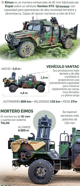 Dentro del programa de modernización de los sistemas de armas en el seno de las Fuerzas Armadas en general y del Ejército de Tierra en particular, la Brigada Galicia VII –BRILAT- ha recepcionado recientemente dos sistemas de morteros sobre vehículos (morteros embarcados) modelo EIMOS (Expal Integrated Mortar System).