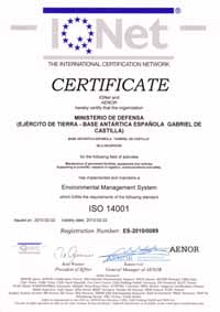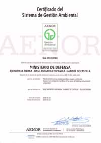 El 22 de febrero de 2010 se logró la Certificación por AENOR del Sistema de Gestión Ambiental implantado en la Base Antártica Española (BAE) Gabriel de Castilla. Con ello se culmina un proceso que se inició diez años antes y que pone de relieve el compromiso del Ejército de Tierra con la protección del medioambiente.