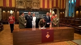 Posteriormente, y acompañado por el resto de autoridades militares de Cataluña: Comandante Militares de Barcelona y Tarragona, Comandantes Naval y Aéreo de Barcelona, y Delegado de Defensa en Cataluña, se trasladaron al Ayuntamiento, donde tras ser recibidos por la Alcaldesa Ada Colau, firmaron en el libro de condolencias. Durante estas firmas estuvieron acompañados por el segundo Teniente de Alcalde, Jaume Collboní.
