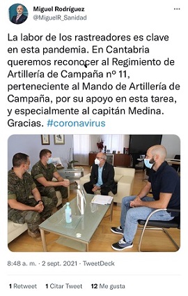 El Consejero de Sanidad de la Comunidad Autónoma de Cantabria, Miguel Javier Rodríguez Gómez, ha reconocido vía Twitter la labor que realizan los rastreadores del Regimiento de Artillería de Campaña nº11