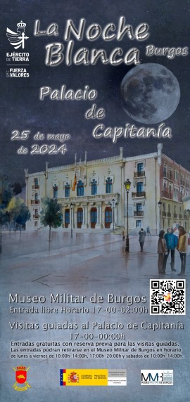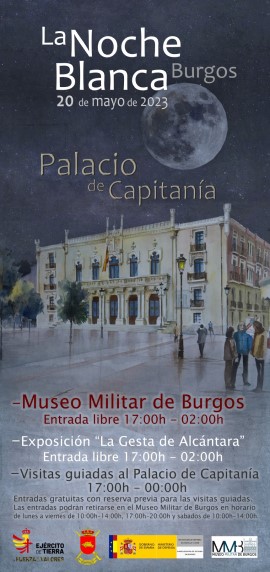 Con motivo de la Noche Blanca de Burgos 2023, que tendrá lugar el sábado 20 de mayo, y dentro del marco del programa de actividades del Ayuntamiento de Burgos, por parte de Representante Institucional de Ejército Tierra en Castilla y León y Cantabria se tienen programadas una serie de actividades, todas ellas tendrán lugar en el Palacio de Capitanía