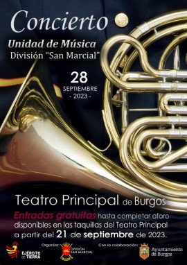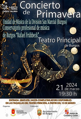 El 21 de marzo, en el Teatro Principal de Burgos, la Unidad de Música de la División San Marcial, en colaboración con el Ayuntamiento de Burgos, presentará un concierto de primavera. En esta ocasión especial, la Unidad de Música se complace en contar con la participación de diecisiete talentosos alumnos del Conservatorio de Música de Burgos "Rafael Frühbeck".