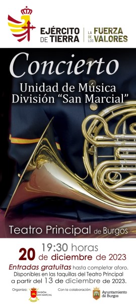 El próximo día 20 de diciembre en el teatro principal de Burgos, la Unidad de música de la División San Marcial, en colaboración con el Ayuntamiento de Burgos, ofrecerá el tradicional concierto de Navidad.