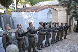 Tras recibir novedades el Comandante Militar, se interpretó “La muerte no es el final” mientras el Guión y los Banderines marchaban a ocupar sus puestos alrededor del Panteón Militar rindiéndoles a los que allí descansan, el más alto homenaje militar, y tras depositarse un centro de flores frente al mismo, se interpretó el Toque de Oración y se ejecutó un disparo de salva por parte del Piquete.
