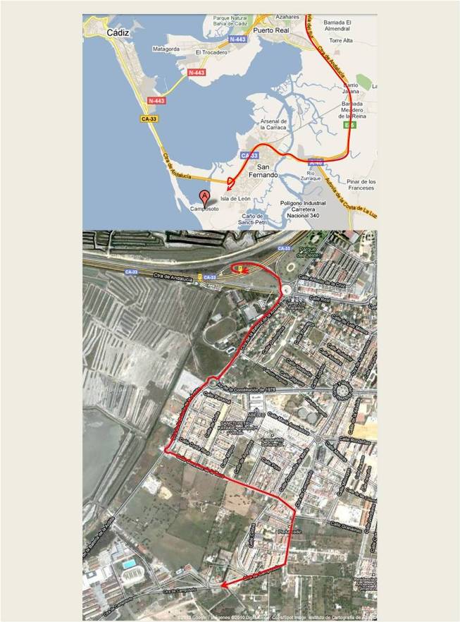 Desde Algeciras: Carretera N-340 por Tarifa hasta Vejer de la Frontera. Seguir Autovía A-48 hacia Cádiz. Al llegar a San Fernando tomar la salida 7 "San Fernando Sur" y continuar hacia el Acuartelamiento por el itinerario descrito anteriormente.