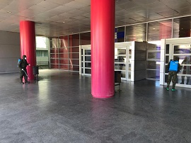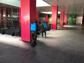 El personal, debidamente protegido con los trajes y máscaras, está desinfectando con productos que eliminan al COVID-19. Se utiliza una disolución de lejía al 0,1% para material no sensible y alcohol reducido a 70º para material sensible y textil. Los trajes son los EPI del Ejército portando la máscara M6-87 con filtro o mascarillas con protección ocular.