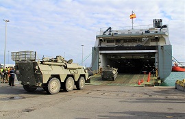 Tras su atraque en el puerto de Ceuta, transportará vehículos y materiales a la península para realizar unas maniobras en Zaragoza.
