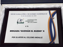 La Brigada “Guzmán el Bueno” X ha recibido una distinción concedida por la Federación Andaluza de Ciclismo por su apoyo al ciclismo andaluz. La entrega ha tenido lugar durante la XXXI Gala que la federación ha llevado a cabo en el teatro El Silo, de la localidad cordobesa de Pozoblanco, el pasado día 16 de diciembre.
