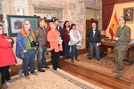 A continuación, se realizó una visita guiada al Palacio de Capitanía al grupo de personas que presenciaron el Relevo Solemne de la Guardia. La visita comenzó en el patio interior donde se realizó un repaso de la historia de la Capitanía General de Galicia, primera Capitanía de España (1480), así como de las principales vicisitudes históricas del edificio, construido a mediados del siglo XVIII. Asimismo, en el atrio, se exhibe la colección histórica de los escudos de España desde la época de los Reyes Católicos hasta la actualidad. Seguidamente, se visitó la Sala de Honor “Teniente General Yagüe” donde se exponen litografías y artículos relacionados con eventos y hechos históricos de la institución y del edificio; acto seguido, el recorrido por el edificio continuó por la parte noble donde visitaron la Sala “Alfonso XIII”, el Salón del Trono y Pasillo de los Espejos. En estas tres estancias se encuentran las colecciones pictóricas más importantes que se exhiben en el edificio, con imágenes relacionadas con el Rey Alfonso XIII y la colección “Los Meses del Año” que fueron dibujados en Flandes, en 1600, por el pintor flamenco Martín de Vos; ambas colecciones pertenecen al Museo del Prado y están en depósito en depósito permanente en este edificio. La visita finalizó en el aljibe original del Palacio, uno de los más grandes de España.