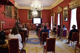 A continuación, por parte del teniente coronel Costas, Jefe de la Oficina de Comunicación Pública (OCP) del CGMAM, se realizó una visita guiada al Palacio de Capitanía General. El recorrido incluyó las estancias más destacadas del edificio entre las que cabe citar: el Salón del Trono, el Pasillo de los Espejos, la Sala Alfonso XIII, el patio cubierto y, finalmente, la Sala de Honor “TG Yagüe”.