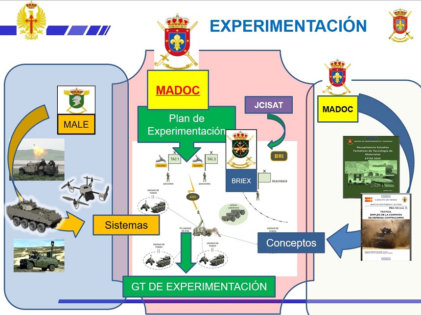 El MADOC, como nivel intermedio, tiene la responsabilidad de dirigir y coordinar el proceso de experimentación. Para ello se ha organizado un Grupo de Trabajo de Experimentación (GTEXP) transversal a todo el ET, compuesto por representantes de todos los Mandos de Primer Nivel y al que se invita a la Unidad Militar de Emergencias para aquellos experimentos que sean de su interés.