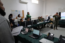 Finalmente, se ha visitado el Centro de Control CIS, donde la Teniente Coronel Sandra Valle Rubio ha presentado los medios y trabajo de su personal, incidiendo en la dificultad que conlleva el enlace y el mando y control de dicho despliegue distribuido por todo el territorio nacional.