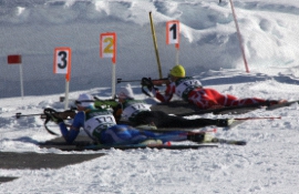 La prueba de biathlon sprint disputada hoy, ha consistido en un recorrido de fondo de 10 km para hombres y 7,5 para damas en técnica libre y desnivel aproximado de 200 m., y una prueba de tiro con 2 entradas en el campo de tiro y 5 disparos por tirada, sobre un blanco de diámetro de 4’5 cm. para la posición de tendido y de 11 cm para el tiro en pie. Se penaliza por blanco no abatido con una vuelta de 150 m al circuito.