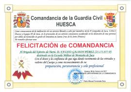 Recientemente se ha recibido en la EMMOE la Felicitación concedida por la comandancia de Jaca al Bg. Galdón por auxiliar a la guardia civil en la detención de una persona por delito de homicidio en grado de tentativa y como reconocimiento de su preparación, perseverancia y celo profesional.