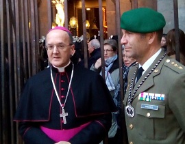 Uno de los momentos más emotivos, que numeroso público contempla mostrando un respetuoso silencio, es la salida de la Catedral de Jaca de la Imagen del Cristo de Biscós a los acordes del Himno Nacional, mientras la escuadra de gastadores del Regimiento presenta armas.