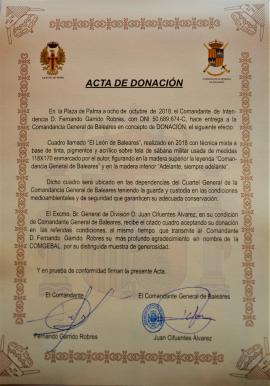 El Comandante de Intendencia D. Fernando Garrido Robres, ha donado a la Comandancia General de Baleares una de sus obras titulada "El León de Baleares". Dicho cuadro ha sido realizado en 2018 aplicando técnica mixta a base de tinta, pigmentos y acrílico sobre sábana militar, enmarcado por el mismo autor figurando sobre su madera superior "Comandancia General de Baleares" y sobre la inferior "Adelante, siempre adelante".